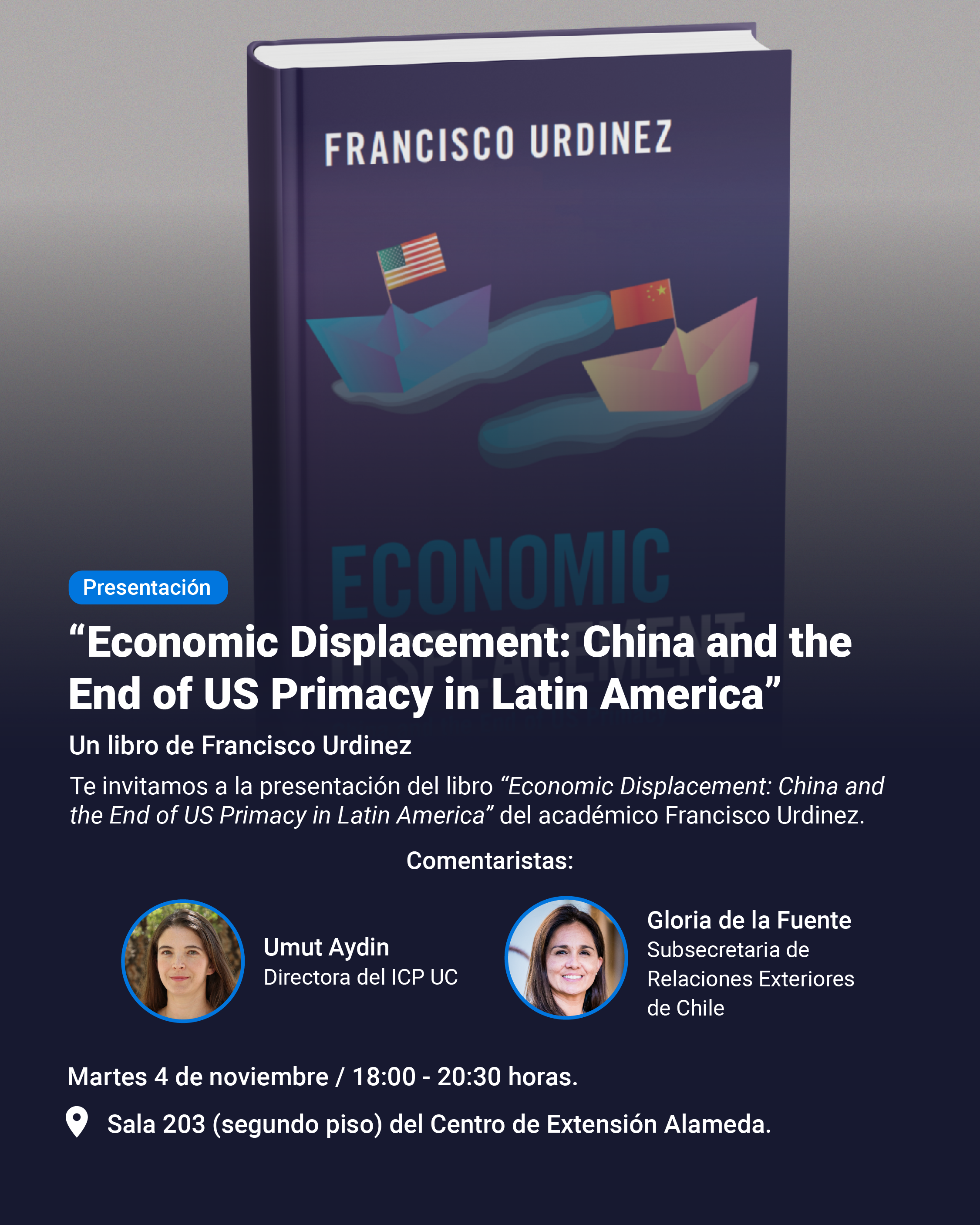 Presentación del libro “Economic Displacement: China and the End of US Primacy in Latin America” de Francisco Urdinez, con Umut Aydin, Directora del ICP UC y Gloria de la Fuente, Subsecretaria de Relaciones Exteriores de Chile como comentaristas.